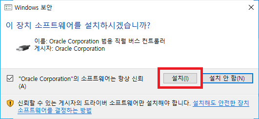 설치 중간에 드라이버 사용을 위한 설치 알림 창이 뜨는데