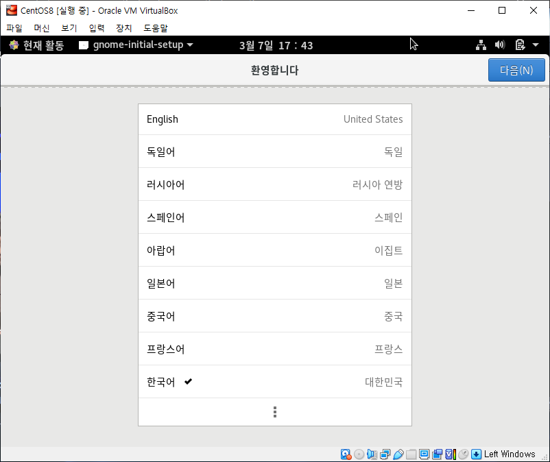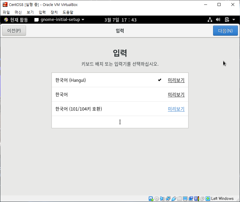 설정 완료후에 한국어를 선택하고 키보드는 한국어(Hangul)을 선택해야 한글 입력이 가능하다고 한다.