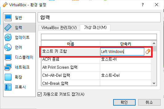 호스트 전환 키 변경은 VirtualBox 파일 - 환결설정 - 입력 - 가상머신 - 호스트 키 조합에서 변경 가능하다.