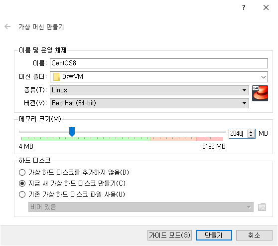 이름을 CentOS8로 입력했더니 종류와 버전이 알아서 Linux와 RedHat으로 변경되었다.