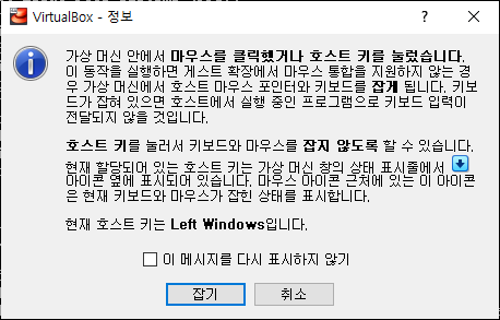 처음 호스트 전환 키가 Left Control이었나.. 그랬던것 같은데 처음에 키를 모르고 닫아버려서 호스트 전환이 안되서 한참 해맸었다.. ;;