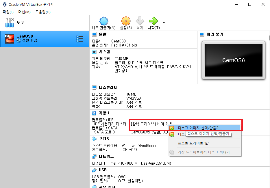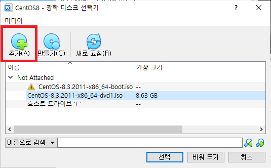 추가 버튼을 눌러서 미리 다운받은 CentOS 8 iso파일을 선택해주면 된다.
