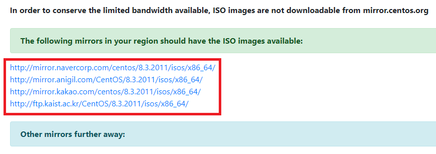 iso 이미지 파일을 다운받을 수 있는 미러링 사이트 리스트가 뜬다.