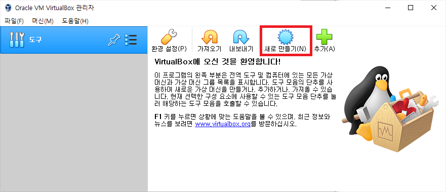 설치를 위한 이미지 파일로 받았으니 virtualBox를 켜서 본격적으로 만들어보겠다.