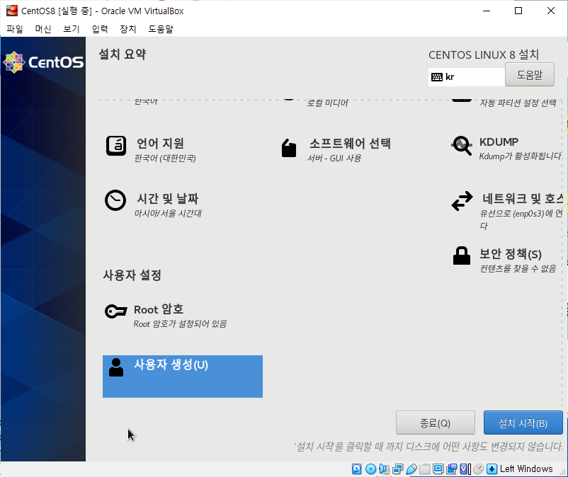 마지막으로 사용자 설정에서 root 계정 암호와 사용자 계정을 생성하면 본격적인 설치가 진행된다.