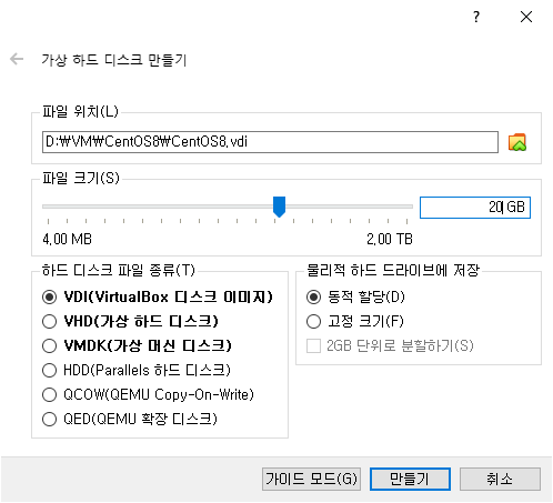 파일 크기도 넉넉하게 20기가로 잡았다.