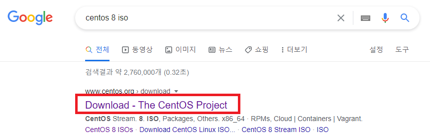구글에 centos 8 iso라고 검색하면 최상단에 다운로드 페이지 링크가 뜬다.