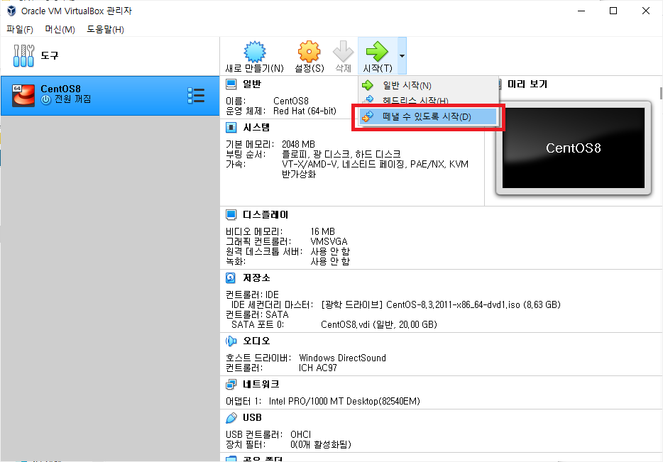 만들기를 누르면 VirtualBox 목록에 내가 추가한 centOS가 추가되었다.
