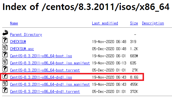 클릭해서 들어가면 iso파일, manifest파일, torrent 파일 등등 리스트가 보여진다.