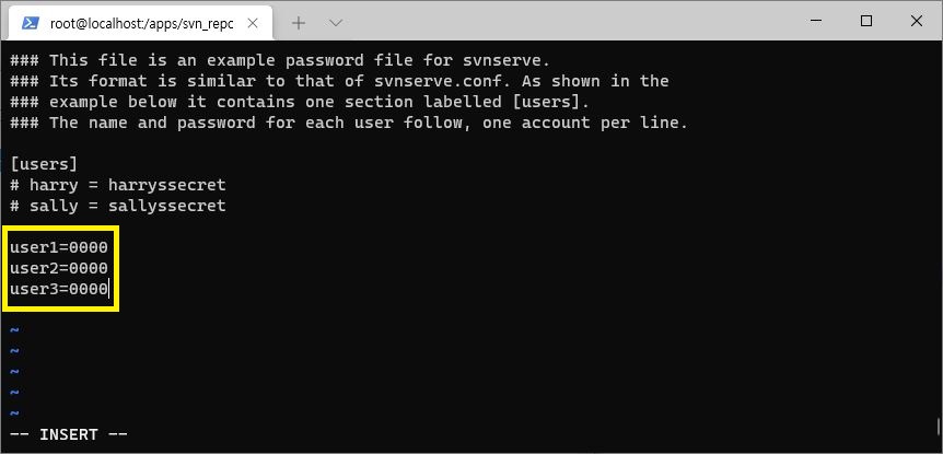 svn 사용을 위한 계정은 conf/passwd 파일에서 관리한다.
