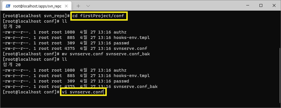 svn 서비스 실행을 위한 svn 서버 설정 작업을 진행한다.