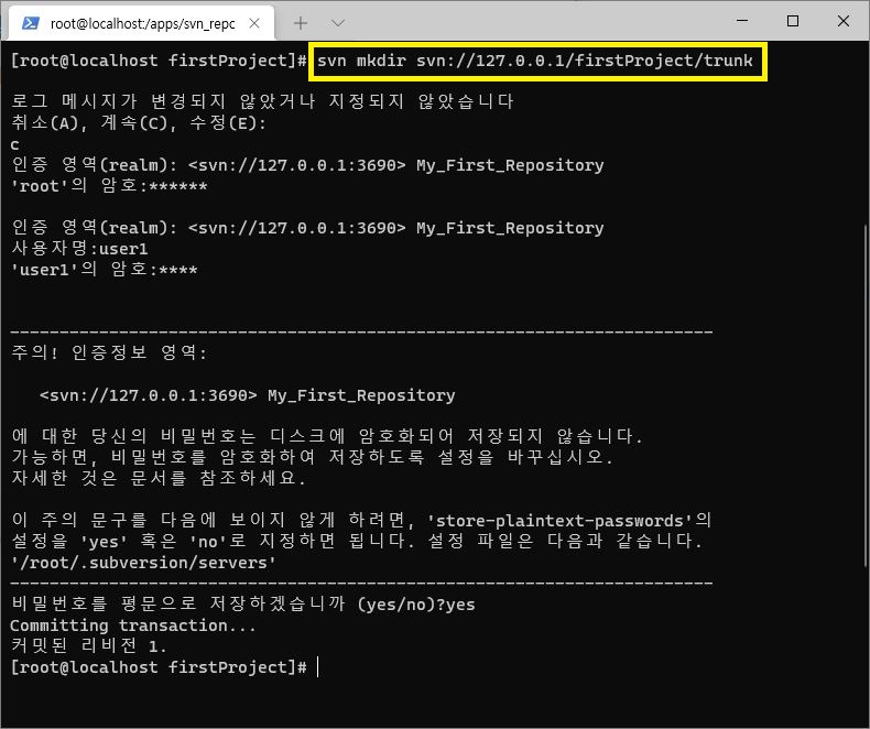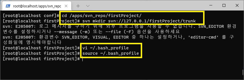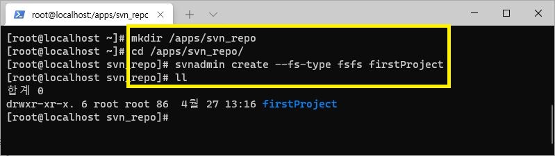 svn 저장소로 사용할 디렉토리의 루트저장소 만들어준다.