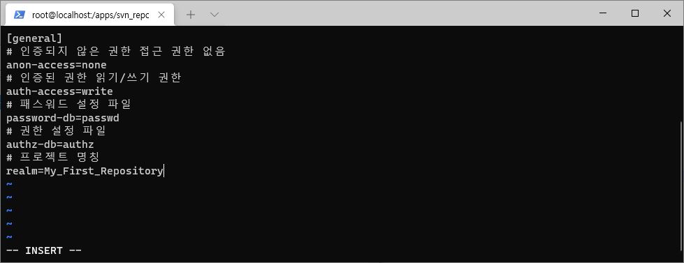 svn 인증 설정을 위해 svnserve.conf 파일을 편집기로 열어준다.