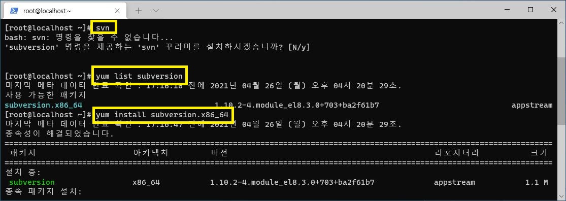 먼저 svn 명령어를 통해 linux에 svn 설치여부를 확인한다.