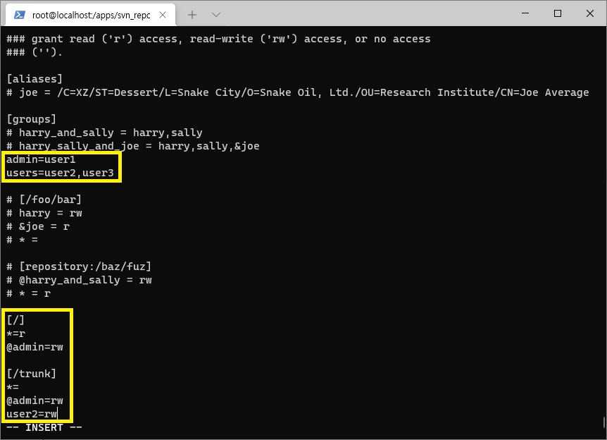svn 사용을 위한 계정은 conf/passwd 파일에서 관리한다.