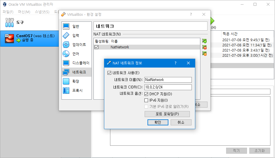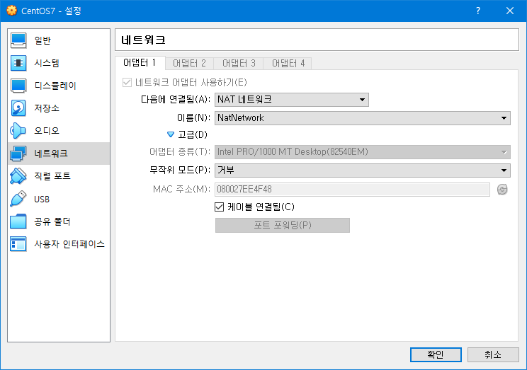 설정 후 각 가상머신별로 설정 > 네트워크 > 네트워크 어댑터 사용하기 체크 > 다음에 연결됨(A): NAT 네트워크