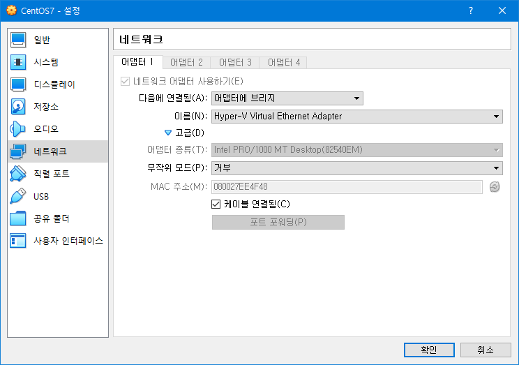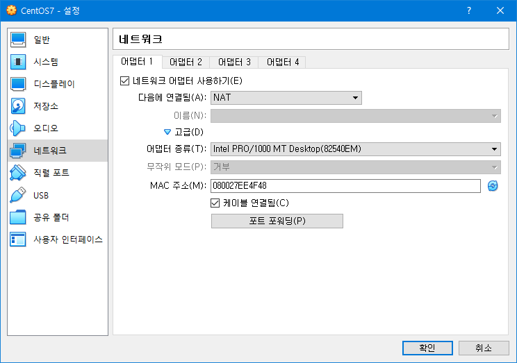VirtualBox 이미지 선택 > 설정 > 네트워크 > 네트워크 어댑터 사용하기 [체크] > 다음에 연결됨(A) : NAT