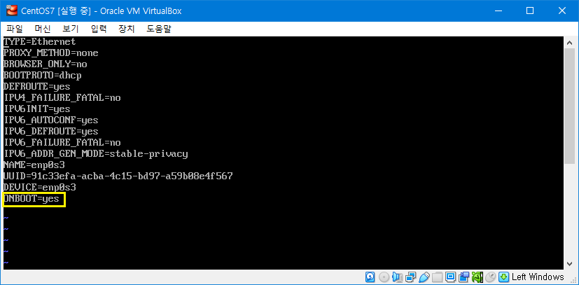 ONBOOT=yes로 변경 후 저장(부팅 시 네트워크 자동 시작)