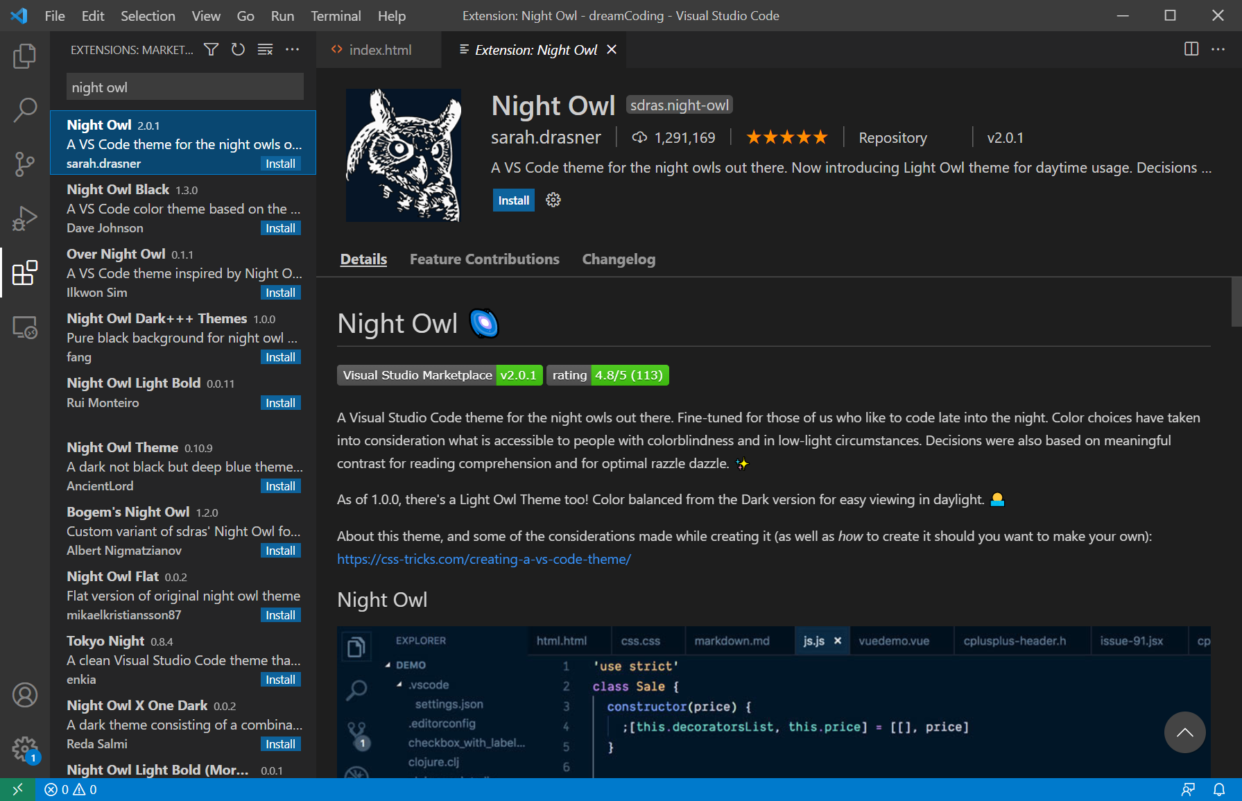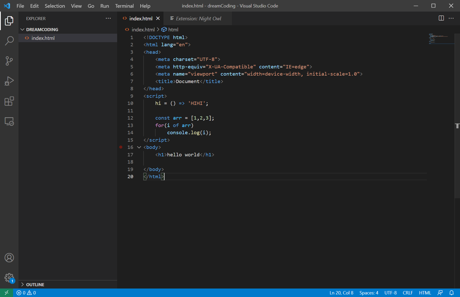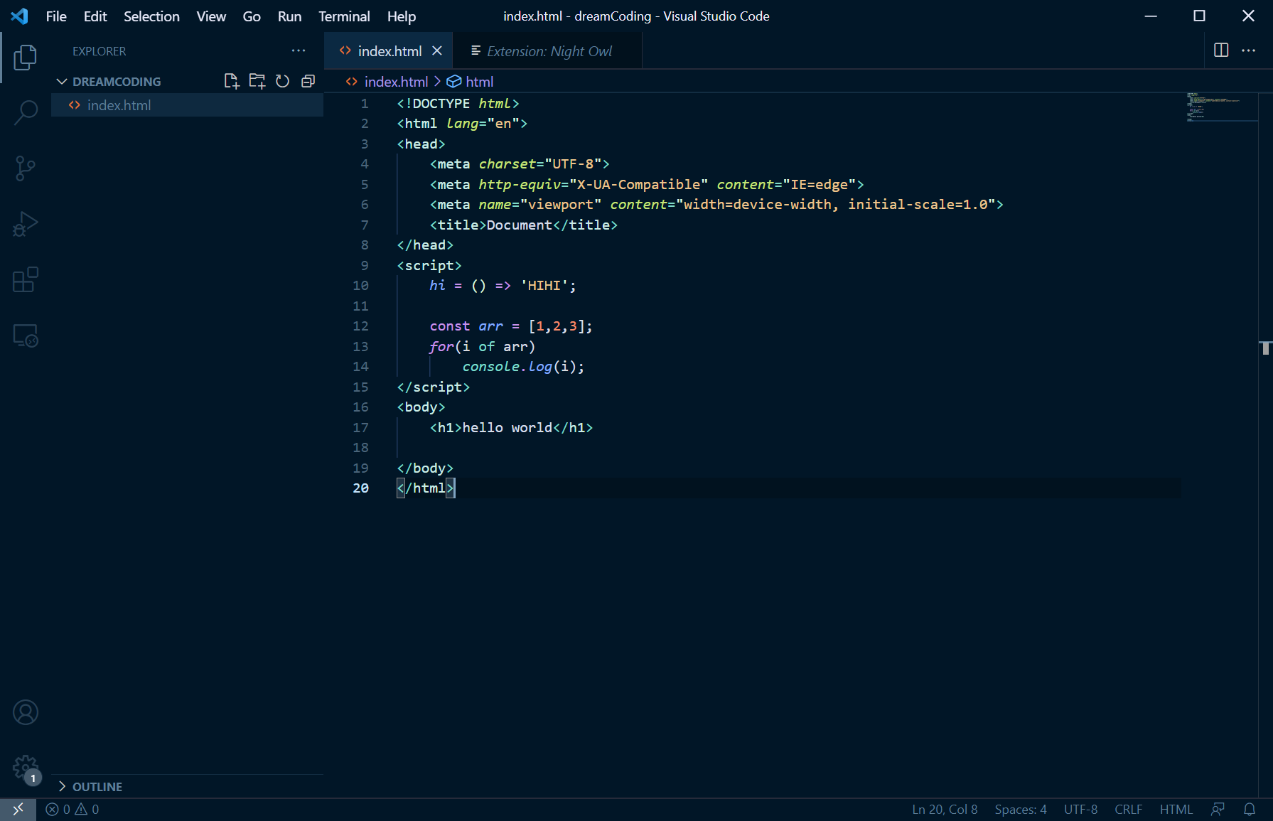 night owl 테마 적용 후의 vscode이다.