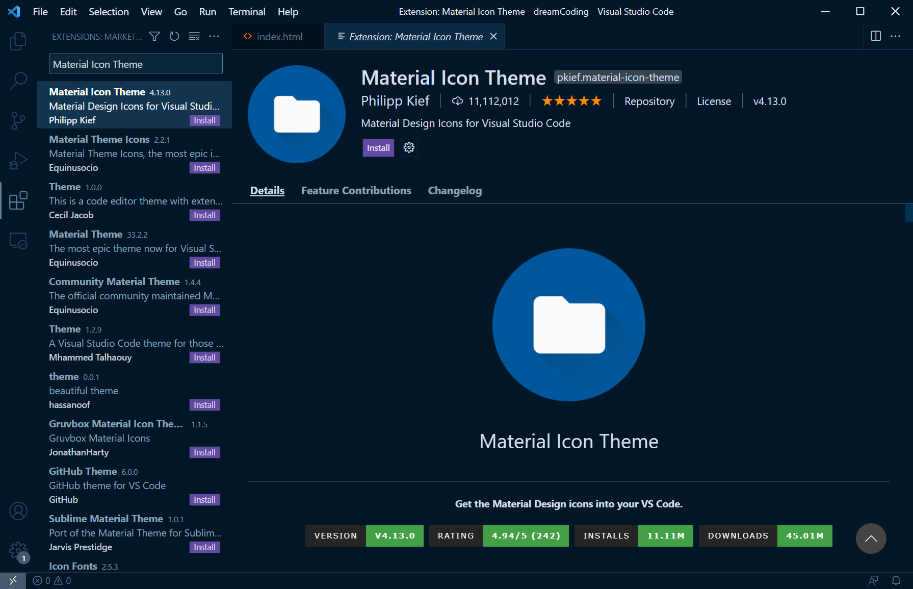 Material Icon Theme 입력 후 검색하면 최상단에 조회가 된다.