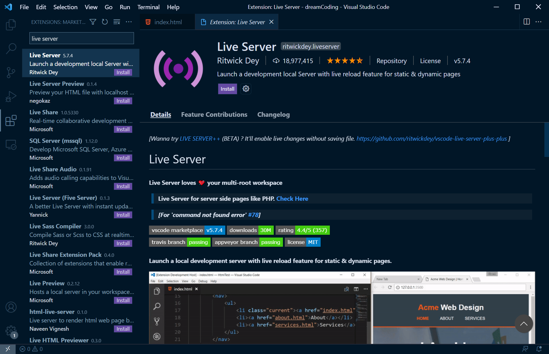 vscode에는 현재 작성중인 소스를 쉽게 확인할 수 있는 Live Server라는 확장 프로그램을 제공한다.