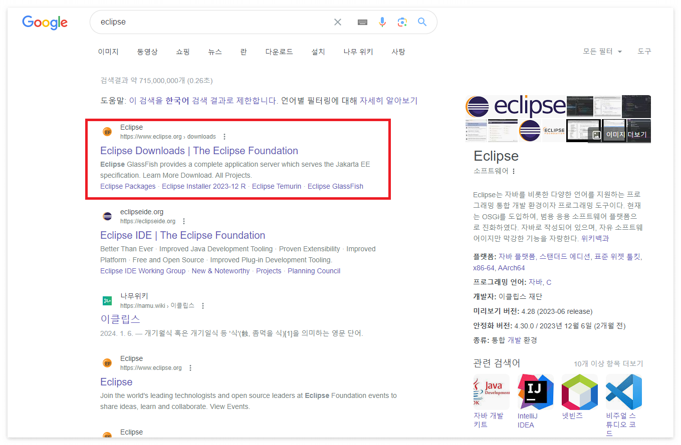 검색창에 검색했을 경우 검색 첫번째에 보이는 Eclipse Downloads를 눌러 해당 사이트로 들어간다.