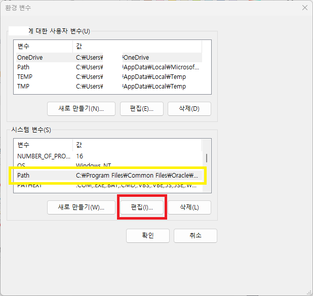 8. 환경 변수 창 > 시스템 변수에서 변수 명이 Path인 항목을 찾는다.