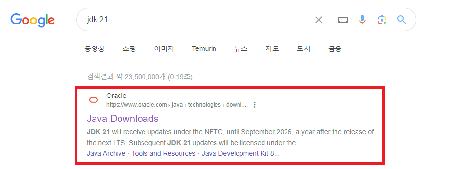 1. 구글 검색창에 jdk 21 로 검색 or https://www.oracle.com/kr/java/technologies/downloads/ 해당 링크 클릭