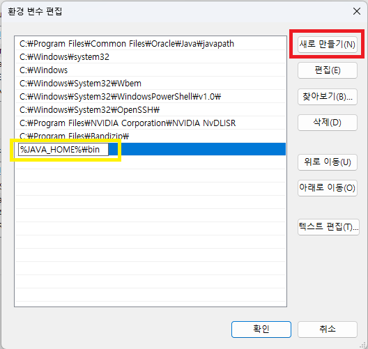 %JAVA_HOME%\bin 을 추가 후 확인 버튼을 누른다.