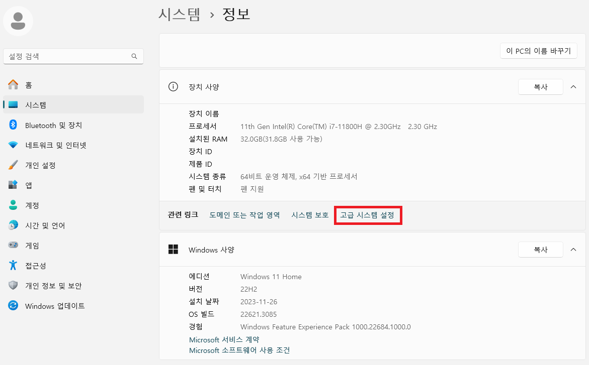 5. 시스템 > 정보 창이 뜨면 중간의 고급 시스템 설정을 클릭한다.