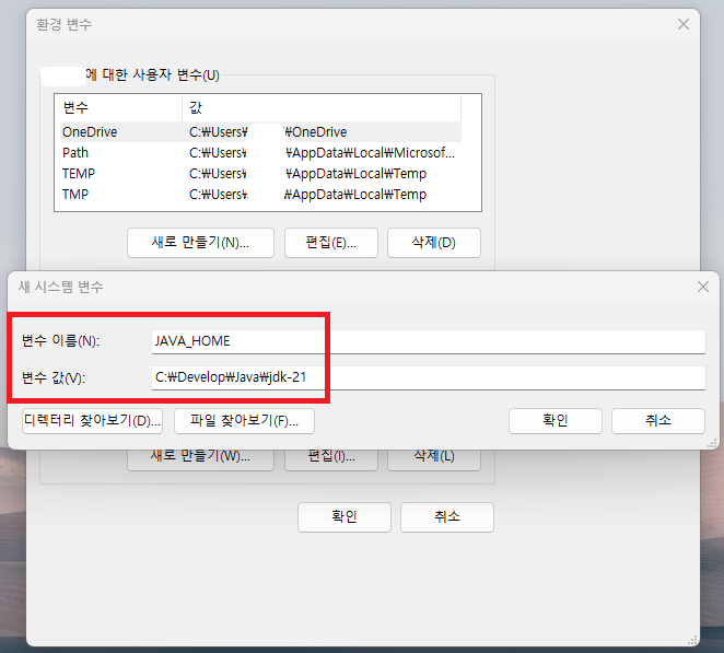 새 시스템 변수 창이 뜨면 변수 이름에 JAVA_HOME 을 입력하고,