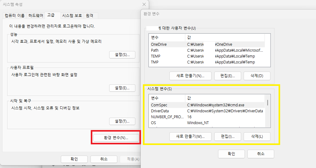 확인 버튼을 눌러 시스템 속성창까지 닫아준다.