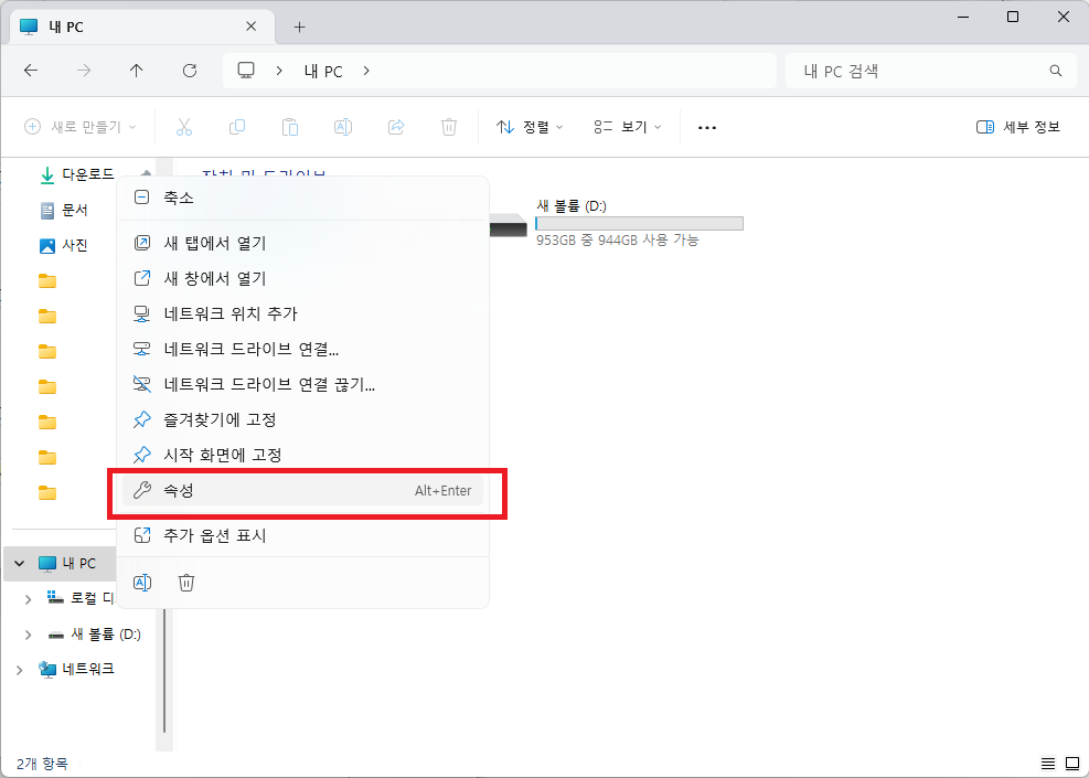 먼저 window+E 키로 디렉토리를 연 다음 좌측 하단의 내 PC 마우스 오른쪽 클릭해서 속성으로 들어간다.
