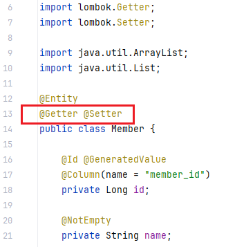 클래스 명 위에 @Getter, @Setter 어노테이션을 추가하여 편하게 사용할 수 있다.
