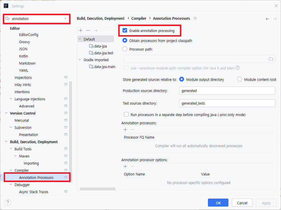 설정 창에서 annotation으로 검색 후, Annotation Processors 항목을 선택한다.