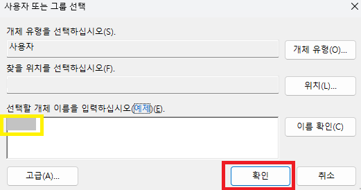 개체 유형 > 사용자 > 개체 이름에 본인의 윈도우 계정 이름을 넣어준다.