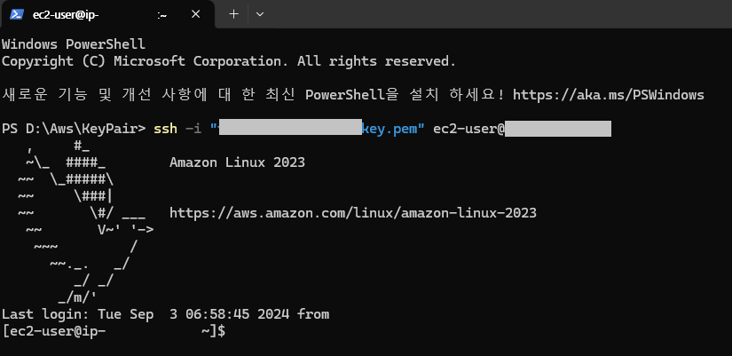 명령어는 ssh -i "키파일명.pem" ec2-user@인스턴스IP 이다.