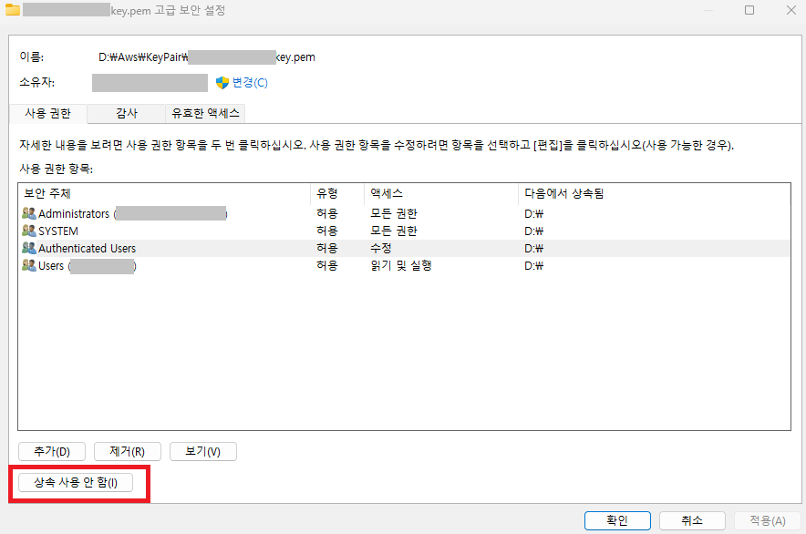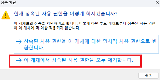 상속 사용 안 함 > 권한을 모두 제거합니다.