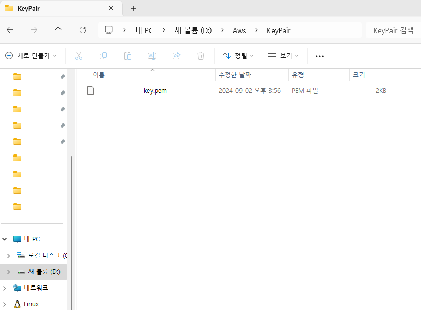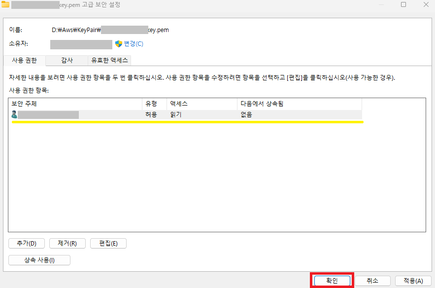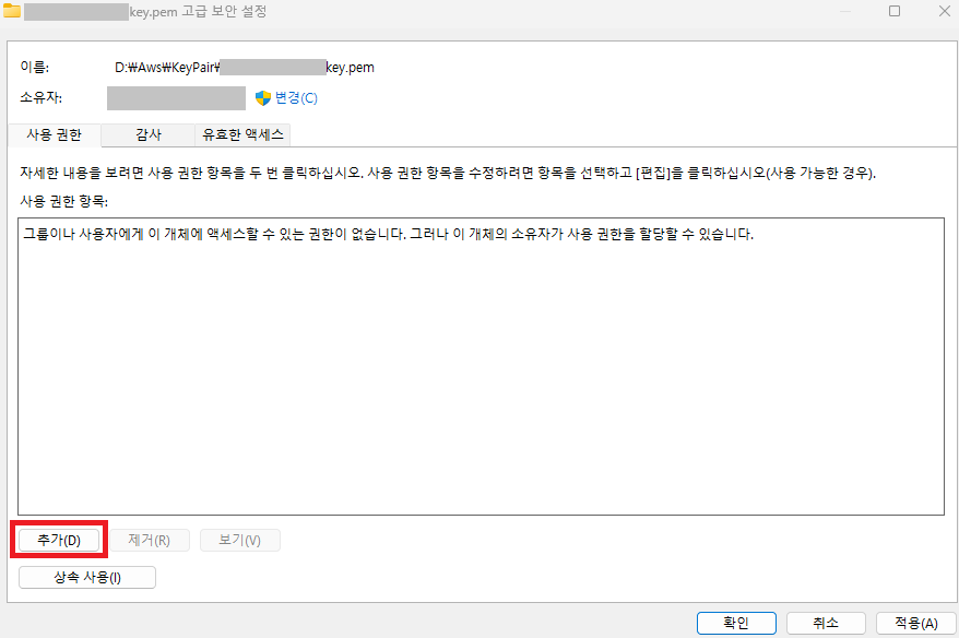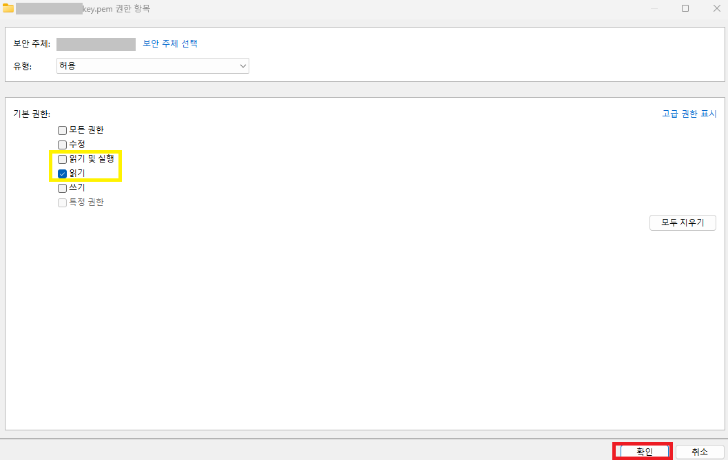 리눅스 환경의 경우 chmod 400으로 권한을 바꿔줄 수 있지만 윈도우는 chmod 명령어가 없다..