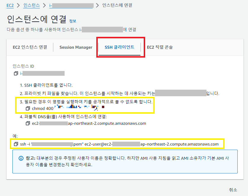 인스턴스 연결 예시를 복사해서 그대로 붙여넣어도 접속이된다.