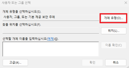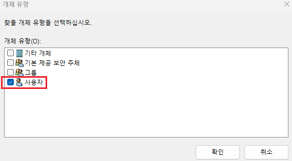 개체 유형 > 사용자 > 개체 이름에 본인의 윈도우 계정 이름을 넣어준다.
