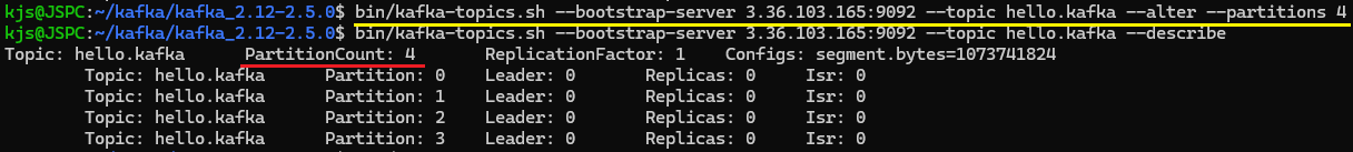 bin/kafka-topics.sh --bootstrap-server 카프카브로커IP:포트 --describe --topic 토픽명