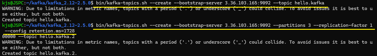 --replication-factor 1로 설정할 경우 복제를 하지 않고 사용하겠단 의미이며, 2면 1개의 복제본을 생성한다.