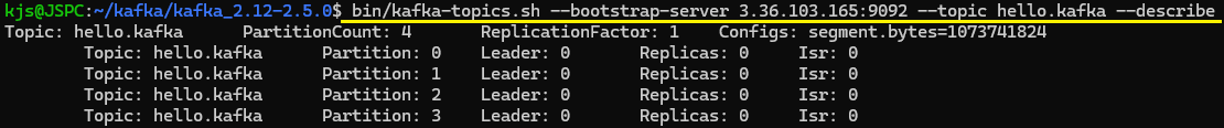 bin/kafka-topics.sh --bootstrap-server 카프카브로커IP:포트 --describe --topic 토픽명