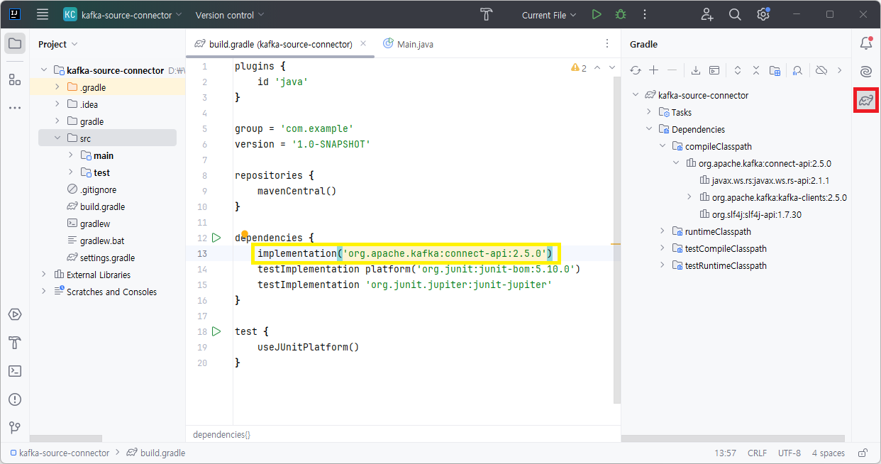 소스 커넥터를 만들 때는 connect-api 라이브러리를 추가해야 한다.