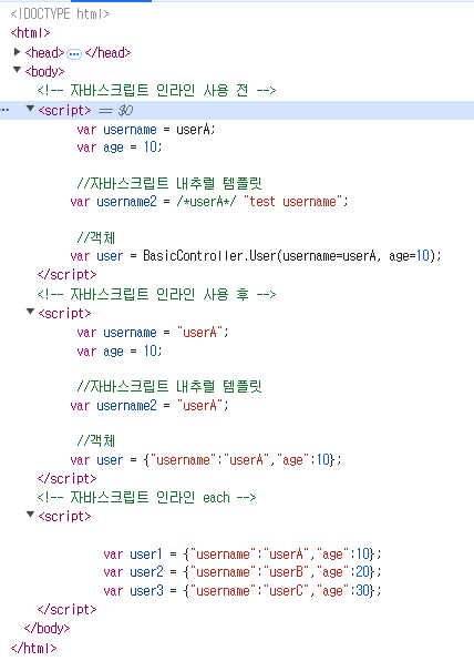 -> 자바스크립트 인라인을 사용하지 않으면 var username2 = /*userA*/ "test username"; 으로 렌더링된다.
