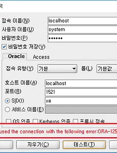 Database/Oracle2 [Oracle] 테이블 스페이스 생성 및 계정 생성, 권한 부여 * 테이블스페이스 생성 CREATE TABLESPACE [테이블스페이스명]DATAFILE '[데이터파일경로]' SIZE [파일사이즈][K | M]NEXT [증가사이즈] MAXSIZE [최대사이즈 | UNLIMITED]AUTOEXTEND [ON | OFF][ONLINE | OFFLINE][LOGGING | NOLOGGING][PERMANENT | TEMPORARY]EXTENT MANAGEMENT [DICTIONARY | LOCAL [AUTOALLOCATE | UNIFORM]]BLOCKSIZE [사이즈][K | M]SEGMENT SPACE MANAGEMENT [AUTO | MANUAL]FLASHBACK [ON | OFF]; TABLESAPCE :: 테이블스페이스의 이름을 지정한다.DATAFILE :: 테이블.. 2018. 4. 11. [Oracle] 오라클 에러 ORA-12505 상태: 실패 -테스트 실패: Listener refused the connection with the following error: ORA-12505, TNS:listener does not currently know of SID given in connect descriptor oracle 설치 후, SQL Developer에 localhost 추가하려니 해당 에러 뜸 접속 정보에 설정한 SID를 현재 인식하지 못했다는 뜻 구굴로 폭풍 검색 후 해결방법 찾음!! CMD에 명령어 "lsnrctl services" 입력 lsnrctl services 명령어는 리스너의 서비스 정보에 대해 얻어오는 명령어 리스너 관령 명령어를 더 알고싶으면 실행창에 "lsnrctl help" 입력 노란색 박스 안의 내용처럼 .. 2018. 4. 11. 이전 1 다음