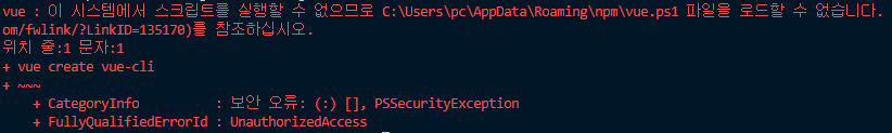 Visual Studio Code 터미널에서 vue create 명령어 수행 시 해당 오류가 발생하는 현상이 발견되었다!!