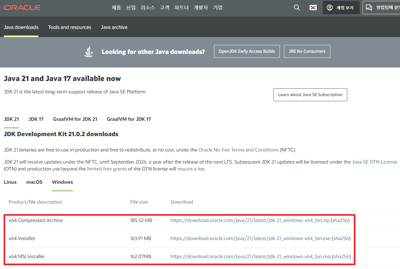 1. 구글 검색창에 jdk 21 로 검색 or https://www.oracle.com/kr/java/technologies/downloads/ 해당 링크 클릭
